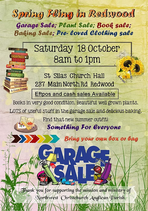 The annual ‘Spring Fling’ garage sale at St Silas Church in Redwood will run this Saturday 18 October from 8am to 1pm. Books, plants, baking, clothes, and more. EFTPOS and cash sales available. See the flyer for more info.