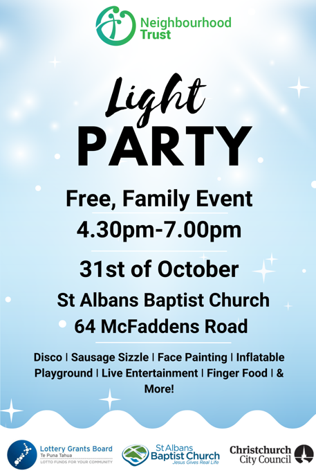 The Neighbourhood Trust’s annual Light Party is taking place this Friday 31 October 2025 from 4:30pm to 7pm at St Albans Baptist Church. This is a free family event, with a Scavenger Hunt, Crafts, Black Light Disco, Go Carts, Face Painting, Dunking Machine, Inflatables, Sausage Sizzle and much more.