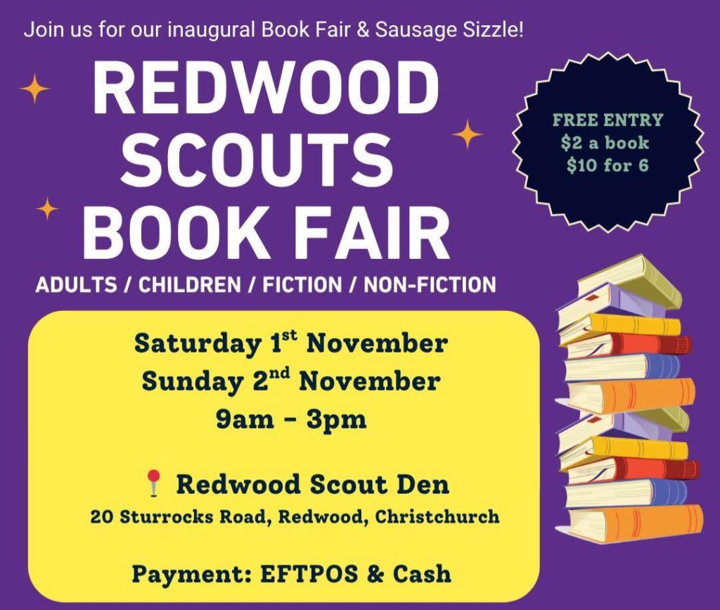 Redwood Scouts have a book fair this weekend – Saturday and Sunday 1 & 2 November, from 9am to 3pm each day at the Redwood Scout Den, 20 Sturrocks Road. See the flyer for more info.