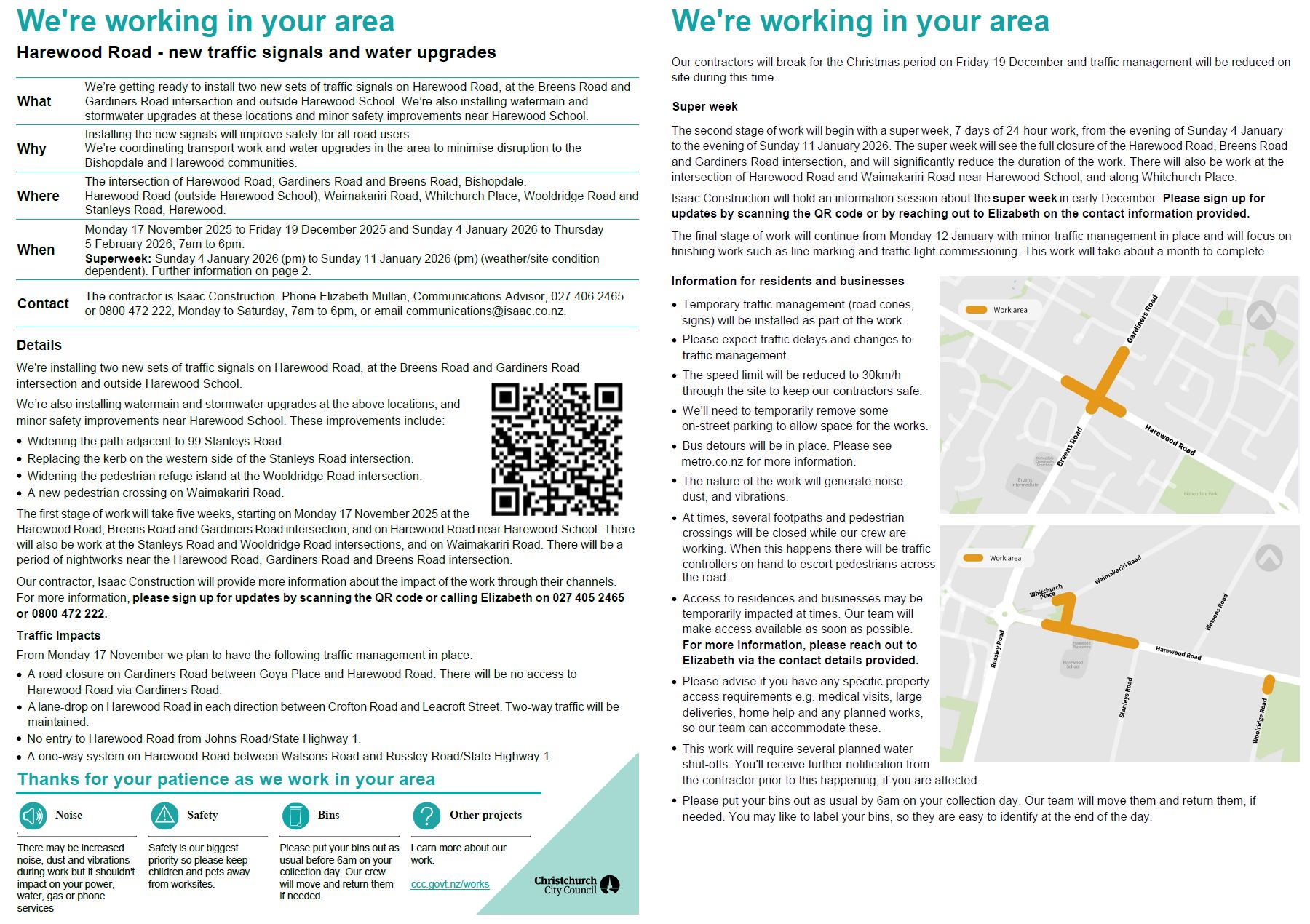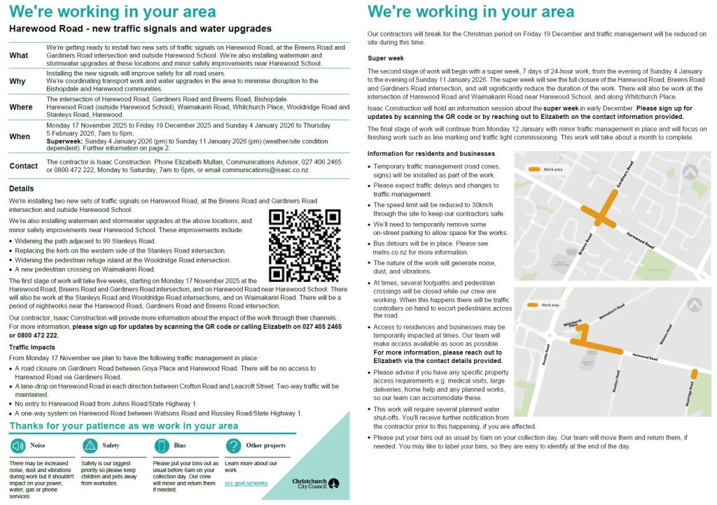 The second stage of work will begin with a super week, 7 days of 24-hour work, from the evening of Sunday 4 January to the evening of Sunday 11 January 2026. The super week will see the full closure of the Harewood/Gardiners/Breens intersection, and will significantly reduce the duration of the work. There will also be work at the intersection of Harewood Road and Waimakariri Road near Harewood School, and along Whitchurch Place.